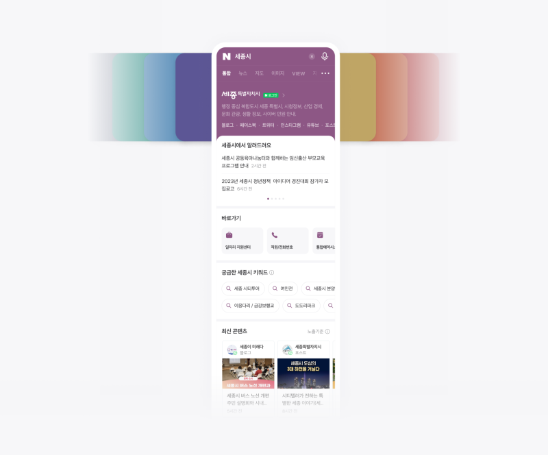 네이버는 이 같은 검색 결과를 제공하기 위해, 각 정보의 특성에 따라 맞춤형 UI(User Interface)와 디자인 등 가독성을 높일 수 있는 콘텐츠 포맷을 별도로 설계했고, 세종시는 이에 맞춰 시정 소식 등 주요 데이터를 구조화 하여 네이버 검색에 효율적으로 노출될 수 있는 형태로 구성했다. 아울러, 네이버 검색 결과 상단 영역에 지자체의 아이덴티티를 표현할 수 있는 다양한 컬러셋을 제공한다.