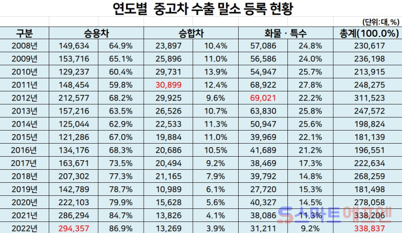 연간 수출 말소 차량은 1992년 3177대에서 1995년 2만1000여대, 1998년 8만7000여대로 꾸준히 증가해왔다. 2001년에는 11만대로 집계돼 처음으로 10만대를 넘었고, 2004년은 이라크 특수로 27만대로 반짝 급증한 후 2011년까지 10만대 중반에서 20만대 중반을 오갔다.