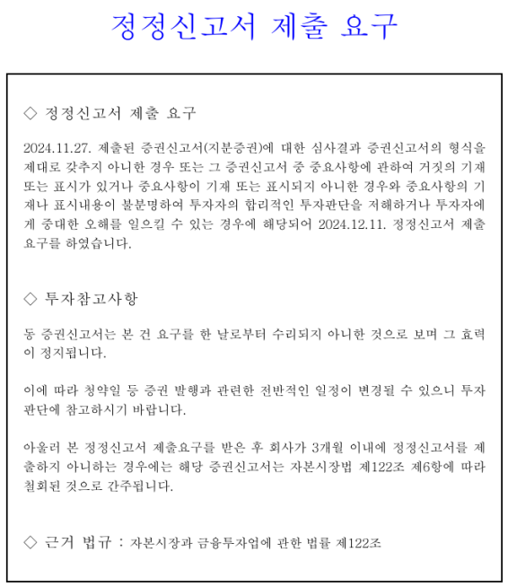 금감원은 증권신고서 형식이 제대로 갖춰지지 않거나 중요사항이 거짓이거나 누락된 경우, 또는 불분명한 내용이 있다고 판단될 때 정정신고서 제출을 요구할 수 있다고 설명했다.