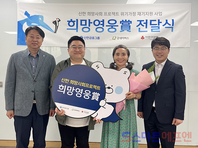 이날 전달식에 참석한 이진호 신한은행 남부본부장과 배광호 굿네이버스 사업운영본부장은 63번째 ‘희망영웅’ 두 사람에게 희망영웅상과 함께 깊은 감사의 인사를 전했다.