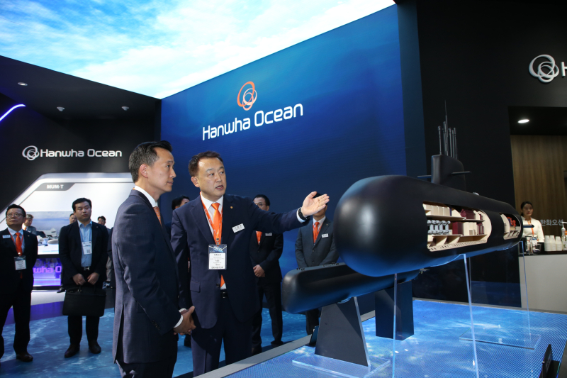 김동관 부회장은 이날 전시장 메인 게이트 바로 앞에 있는 한화시스템 부스를 거쳐 한화오션, 한화에어로스페이스의 부스를 차례로 방문했다.