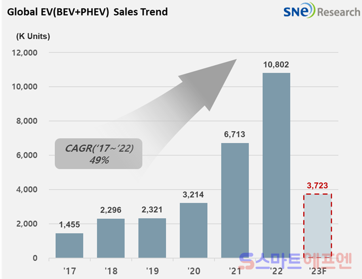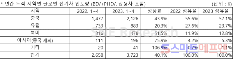 SNE리서치에 따르면 올해 1월부터 4월까지 플러그인 하이브리드(PHEV)를 포함한 글로벌 전기차 인도량은 372만3000대로 전년 동기 대비 40.1% 상승했다.