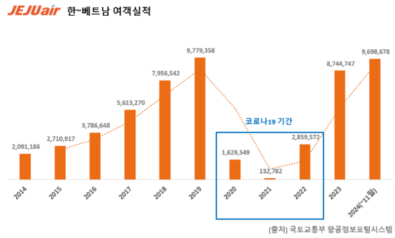 한~베트남 노선은 2014년 제주항공 취항 이후 2019년까지 연 평균 29.3% 성장했다. 코로나19로 인해 잠시 주춤했으나 올해 1월부터 11월까지 11개월간 969만8678명의 여객 수를 기록, 역대 최대 여객 수를 기록한 2019년 977만9358명에 근접했다. 이같은 추세라면 올해 역대 가장 많은 여행객이 베트남을 방문할 것으로 전망된다.