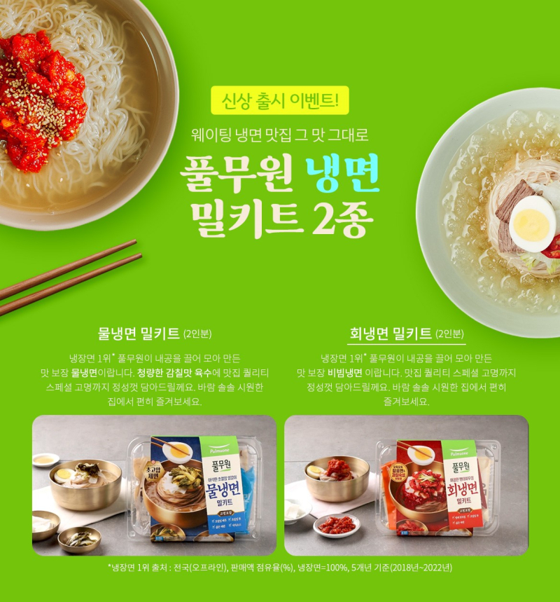 초고압제면으로 쫄깃한 면발과 초절임 무와 얼갈이 배추로 아삭하게 씹히는 식감을 살린 ‘아삭 얼갈이배추 물냉면 밀키트’와 명태회무침을 풍성하게 구성한 비빔냉면 ‘매콤한 명태회무침 회냉면 밀키트’ 2종으로 선보였다.