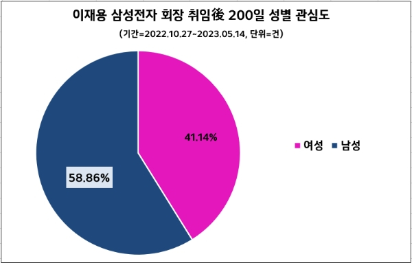 이 회장은 취임 후 200일간 작성자의 성별이 드러난 2076건의 정보량 중 남성 작성자로 드러난 포스팅 수가 58.86%로 나타났다. 여성 작성자의 포스팅 비율은 41.14%로 분석됐다.
