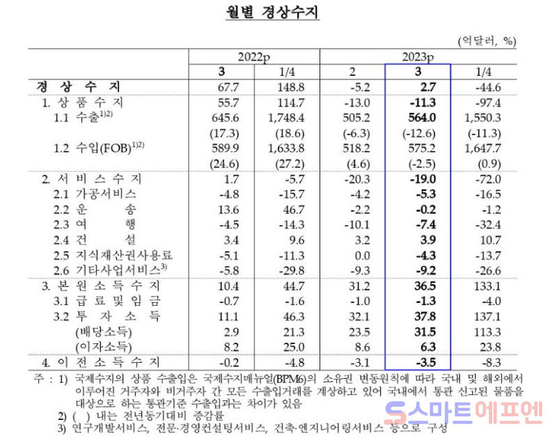 항목별 수지로는 상품수지가 11억3000만달러 적자를 기록했다. 반도체 한파로 인해 수출이 큰 폭으로 감소했다. 이는6개월 연속으로 적자로 1년 전(55억7000만달러)대비 수지가 66억9000만달러나 감소했다. 다만 적자 규모는 통계 집계 이래 가장 컸던 1월 (-73억2000만달러)과 2월(-13억달러)보다는 축소되었다.