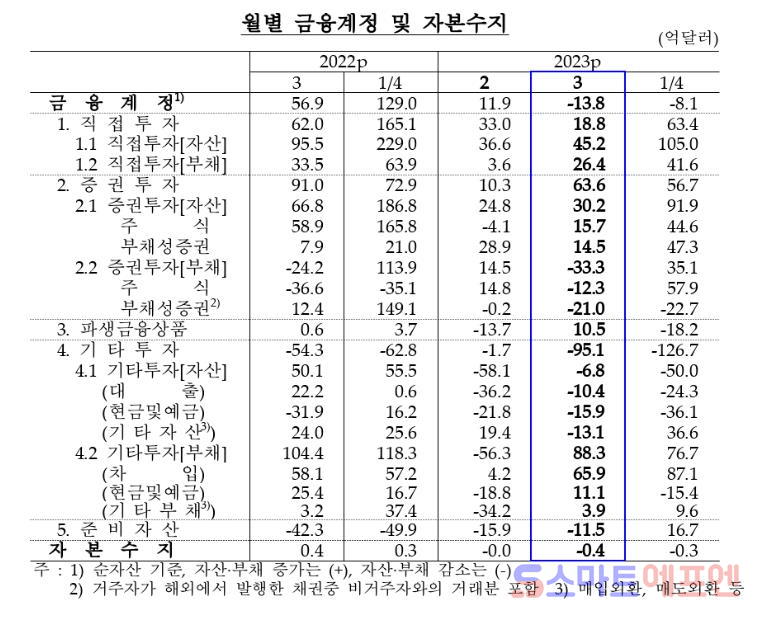본원소득수지 가운데 배당소득수지 흑자(31억5000만달러)가 1년 전보다 28억6000만달러 늘어난 데 가장 큰 영향을 받았다. 이전소득수지는 3억5000만달러 적자를 기록했다.