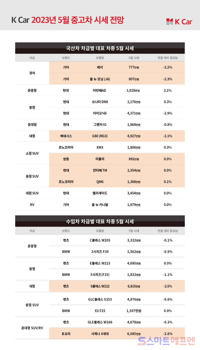 분석 결과 5월 국내 중고차 시장에서 상대적으로 저가인 경유 차량 시세가 변동이 없을 것이며 경차 등 휘발유차량의 시세 하락이 나타날 것이라고 보았다.