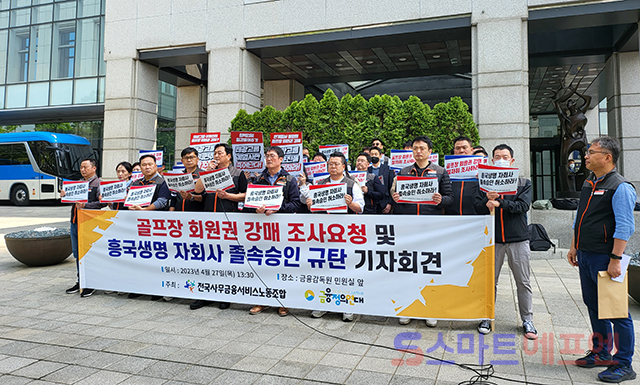 금융정의연대와 전국사무금융서비스노동조합(사무금융노조)은 27일 금융감독원 앞에서 '골프장 회원권 강매사건 신고서 제출 및 흥국생명 자회사 졸속승인 철회 촉구' 기자회견을 열었다.