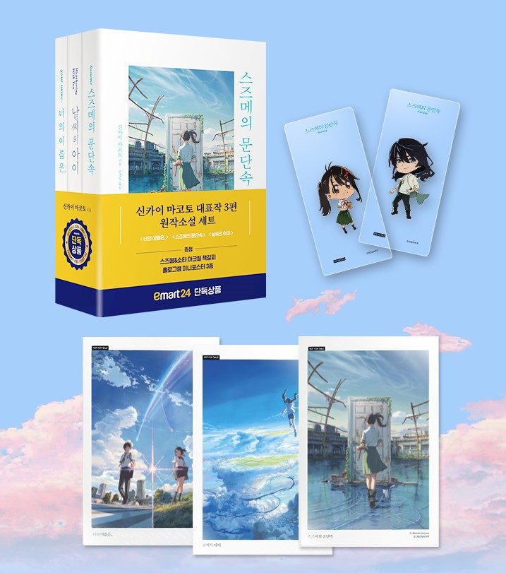 이마트24에서 판매하는 신카이 마코토 패키지 한정판은 신카이 작가의 인기작인 ‘스즈메의 문단속’, ‘너의 이름은’, ‘날씨의 아이’ 도서 3권과 각 작품의 미니포스터 3종, 스즈메의 문단속 캐릭터 책갈피 2매로 구성됐다.