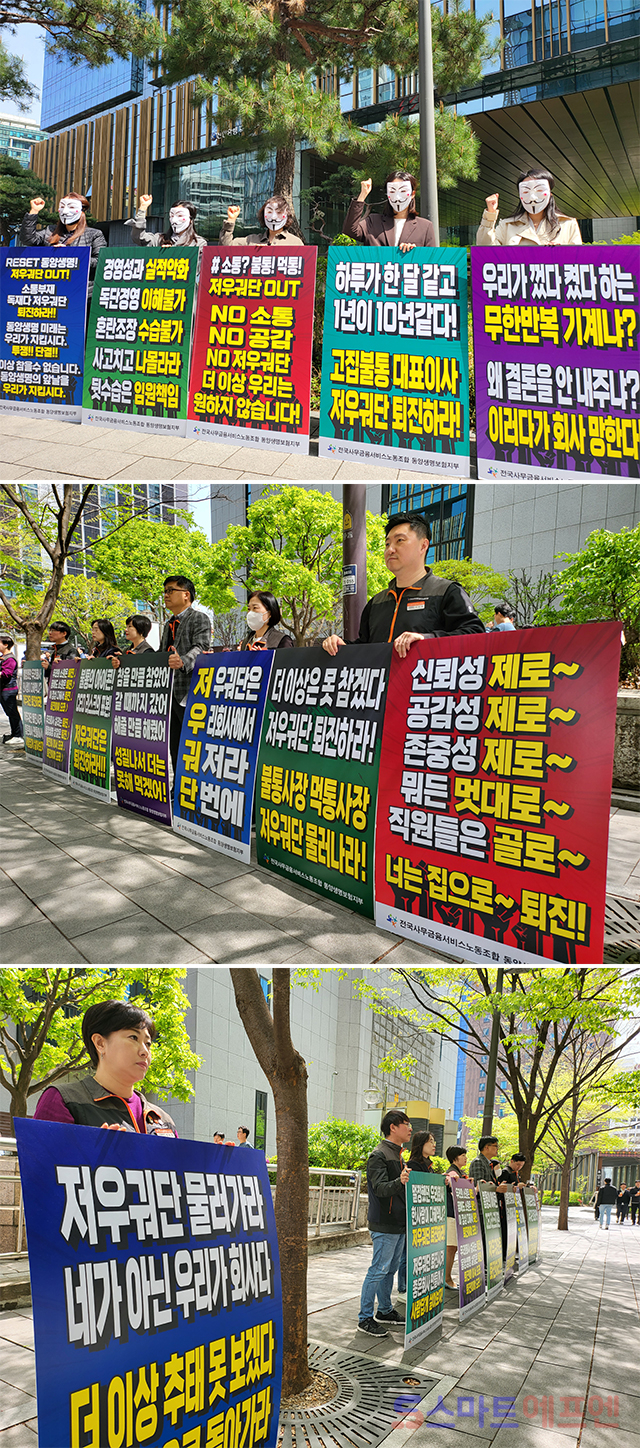 피켓에는 '소통? 불통! 먹통! 저우궈단 OUT', '더 이상은 못 참겠다. 저우궈단 퇴진하라' 등 저우궈단 대표의 퇴진을 촉구하는 내용이 주로 적혀있었다.