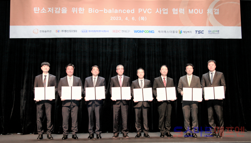 한화솔루션은 7개 PVC가공업체와 탄소저감을 위한 바이오 PVC사업 협력 업무협약 (MOU)을 체결했다. 이날 서울 중구 한화빌딩 본사에서 열린 협약식에는 한화솔루션 남이현 대표와 동신포리마 박영대 대표, 두리화학 최백규 대표, HDC 현대EP 정중규 대표,원풍 서승민 부회장, 제일벽지 박식순 회장 TSC 황웅선 대표, 파워랩 김영민 대표 등이 자리했다.