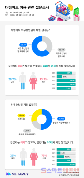 지난 3월 2일부터 4월 3일까지 성인 20대~60대 남녀 2,000명을 대상으로 실시한 설문 결과에 따르면 ‘대형마트 의무휴업일에 대한 생각은?’이란 질문에 ‘의무휴업일이 필요하지 않다’라고 답변한 이들이 전체의 63.3%를 차지했다. ‘의무휴업일이 필요하다’는 36.7%를 기록했다.