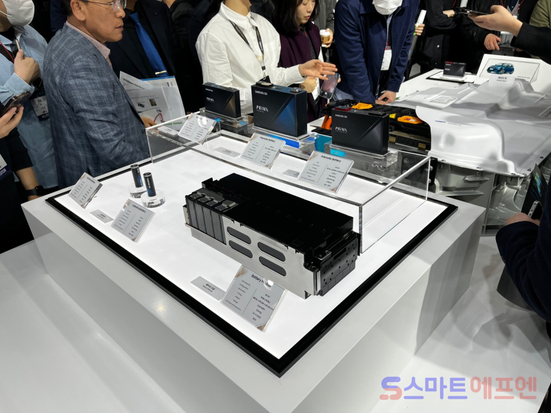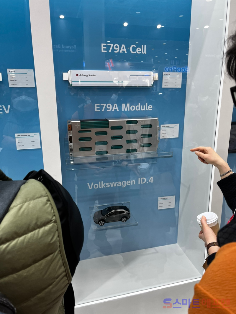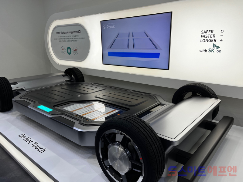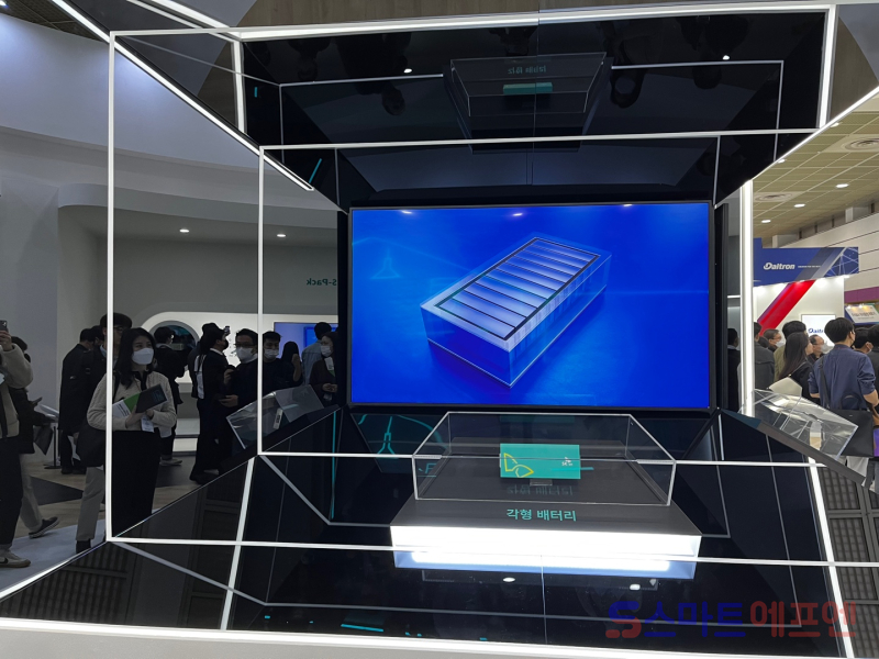 SK온의 부스에서는 각형 배터리의 실물이 부스중앙에 설치되어 있어 관람객들의 눈길을 끌었다. 이외에도 LFP,코발트 프리와 미래의 기술 전고체 배터리를 선보였다. 아직 연구단계에 있는 전고체 배터리는 실물로 볼 수는 없었다. 하지만 전고체 배터리는 리튬이온대비 열적 안정성이 뛰어나 화재위험성이 줄어들고 에너지 밀도가 높아 더 많은 용량의 배터리가 탑재가 가능해 이후 전기차 시장의 중요한 기술이 될 전망이다.