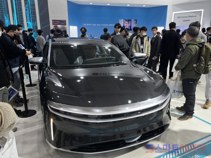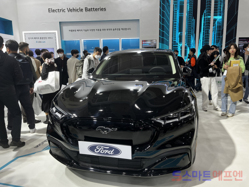 부스 중앙에는 LG에너지솔루션의 배터리가 들어간 포드의 머스탱마하-E와 국내에서는 철음으로 전시되는 루시드 모터스의 세단 루시드에어가 전시되어 있었다. 직접 타볼 수 있는 기회를 제공해 차에 타보려는 사람들로 줄을지었다.