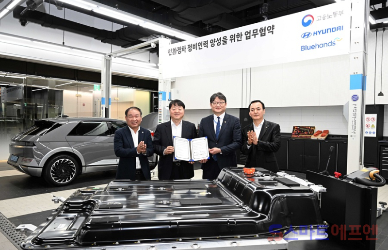 현대차는 15일 고양하이테크센터에서 유원하 현대차 국내사업본부장, 권기섭 고용노동부 차관, 이교열 종합블루핸즈연합회 회장, 박민수 현대정비가맹점연합회 회장 등 주요 관계자들이 참석한 가운데 ‘친환경차 정비 인력 양성을 위한 업무협약(MOU)’를 체결했다.