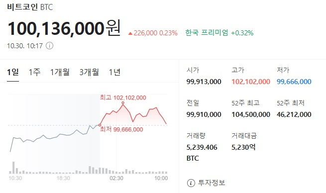 30일 오전 10시 18분 현재, 국내 기준으로 비트코인 가격은 1억 13만6000원으로 1억원을 돌파했다. 한국 프리미엄(0.32%)이 반영된 가격이다.