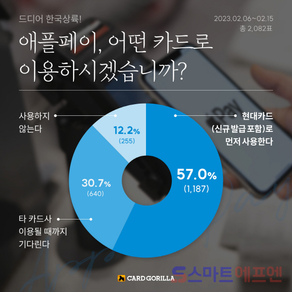 이번 설문조사 결과, 과반수(57.0%, 1,187표)가 ‘현대카드(신규 발급 포함)로 애플페이를 먼저 사용하겠다’고 응답했다. 2위는 ‘타 카드사 이용될 때까지 기다린다’(30.7%, 640표)가 차지했다. 한편 ‘사용하지 않는다’도 12.2%(255표)에 달했다.