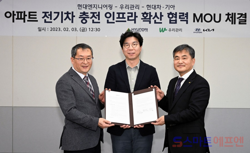 현대차·기아는 지난 3일 서울 종로구 현대엔지니어링 계동사옥에서 현대엔지니어링, 우리관리와 함께 아파트 전기차 충전 인프라 확산을 위한 3자 MOU를 체결했다고 7일 밝혔다. 체결식에는 정규원 현대자동차 EV인프라전략실장, 최재홍 현대엔지니어링 자산개발영업실장, 김영복 우리관리 사장 등이 참석했다.