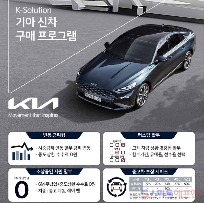 이 외에도 기아 오토 할부를 이용한 개인 고객에 한하여 최대 77%의 중고차 보장 서비스도 제공하고 있다.