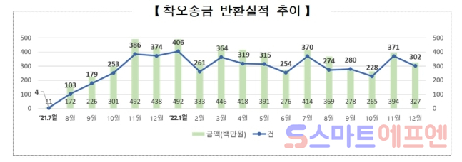예보 측은 "제도 시행 이후 작년 12월 말까지 1만6759명으로부터 239억원 규모의 착오송금 반환 신청을 받아 심사한 결과 7629명(102억원)을 지원대상으로 확정했다"며 "이후 양수한 채권에 대해 반환지원 절차를 진행해 5043명에게 착오송금액 60억원을 찾아줬다"고 설명했다.