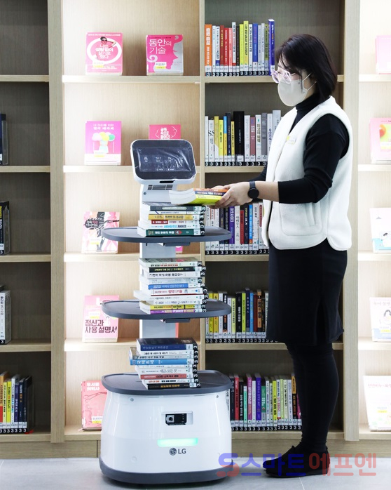 '선반형 LG 클로이 서브봇'은 무인 반납기에 반납된 도서 운반에 활용된다. 무거운 책들을 열람실까지 옮겨줘 편리하다.