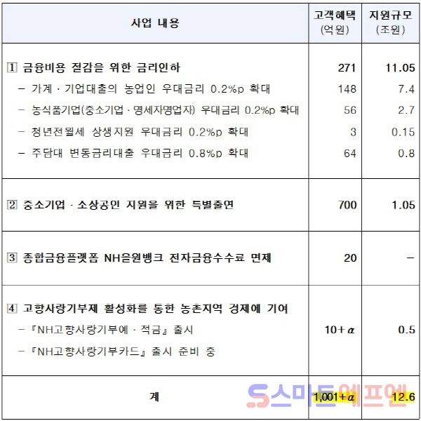 가계·기업 대출시 농업인에게 지원되는 우대금리를 0.3%에서 0.5%로 0.2%p 확대하고 농식품기업을 운영하는 중소기업 및 영세자영업자에 대한 우대금리는 0.1%에서 0.3%로 0.2%p 확대한다.
