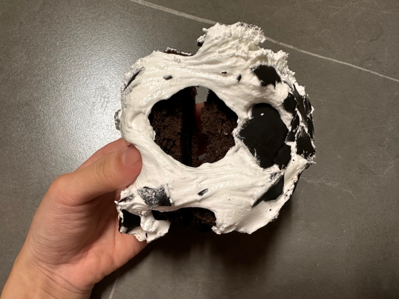 처음 먹었을 때 의 맛은 초코파이와 매우 유사했다. 그러나 계속 먹어보니 다른 디저트였다. 베이스로 깔린 푹신하고 촉촉한 초코 카스텔라 빵이 자칫 초코파이의 맛으로 넘어갈 수 있을 법 할 때 케이크 같은 식감으로 잡아준다.