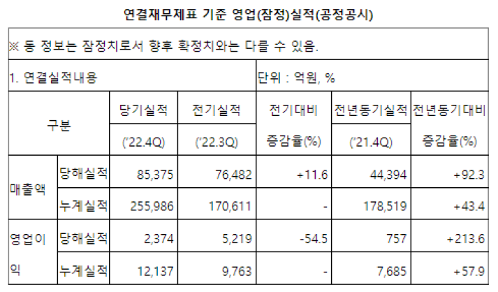 일회성 비용은 연간 실적 호조에 따른 성과급 반영과 재료비, 물류비, 환율과 같은 원가 상승에 따른 ESS 사외교체 비용 증가분으로 이러한 일회성 비용의 반영분을 제외하면 2022년 4분기 영업이익은 전분기와 유사한 수준이다.