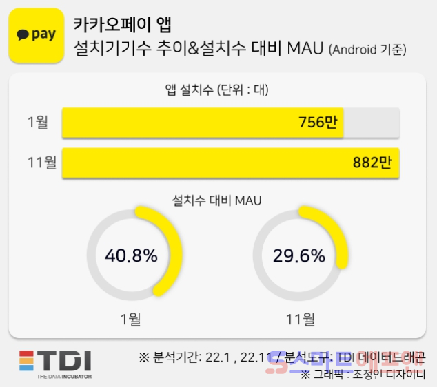 카카오페이 설치기기수는 756만 대 → 882만 대로 16.7%가량 늘었다. 설치수 대비 MAU는 40.8% → 29.6%로 11.2%p 줄었다.