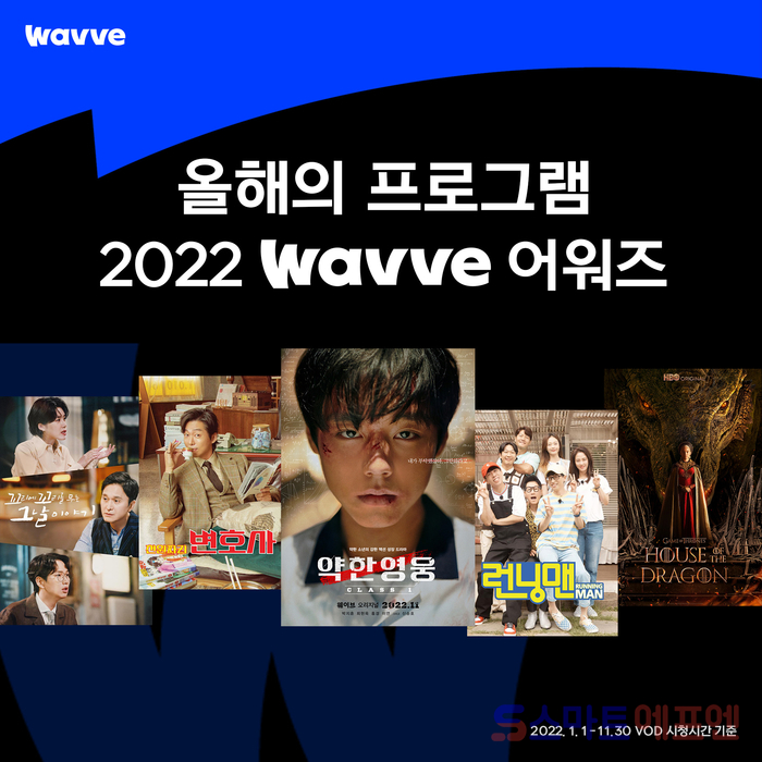 15일 발표한 '2022 웨이브 어워즈'에서 SBS TV 천원짜리 변호사가 올해 드라마 부문 1위를 차지했다. 이종석 주연 MBC TV '빅마우스'와 임시완 주연 웨이브 '트레이서', SBS TV '악의 마음을 읽는 자들' '왜 오수재인가' '어게인 마이 라이프'가 뒤를 이었다. 상위 작품 모두 변호사, 검사, 국세청 조사관, 경찰청 프로파일러를 주인공으로 내세웠다. 이 외 MBC TV '옷소매 붉은 끝동'과 시트콤 '하이킥' 시리즈, KBS 2TV '신사와 아가씨', MBC TV '금수저' 등이 7~10위에 이름을 올렸다.