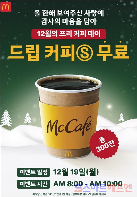 맥도날드는 맥카페에 대한 고객들의 큰 사랑에 보답하기 위해 오는 19일 오전 8시부터 10시까지 제품 구매 여부에 상관없이 모든 매장 방문 고객에게 따뜻한 스몰 사이즈 드립 커피를 무료로 제공한다. 이번 행사는 전국 맥도날드 매장에서 진행되며, 매장 내 프론트카운터 및 드라이브 스루(DT)를 통해 참여 가능하다. 각 매장당 한정 수량인 300잔에 한해 커피를 증정한다.