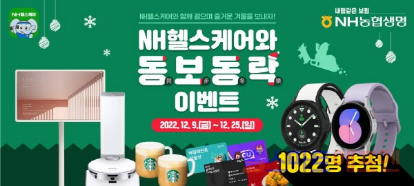 동보동락(同步冬樂)은 NH농협생명의 헬스케어 앱인 ‘NH헬스케어’와 함께 걸으며 즐거운 겨울을 보내자는 의미다. ‘NH헬스케어’는 겨울철 움츠러드는 회원의 건강 증진을 위해 걷기 이벤트를 마련했다.