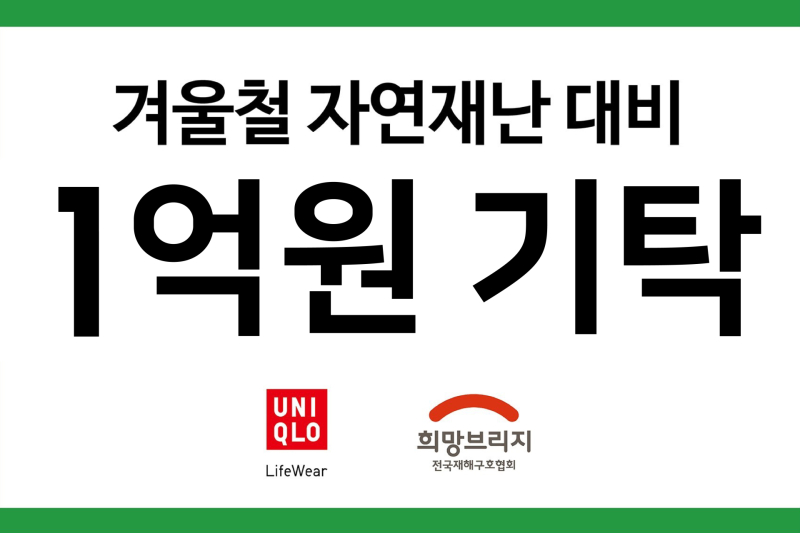 이에 앞서 유니클로는 대설과 한파, 산불 등 겨울철 발생 가능한 자연재난에 대비하고 피해 복구가 필요한 지역 등에 지원하기 위해 국내 최대 재해 구호 단체인 희망브리지 전국재해구호협회에 1억원을 기탁했다.
