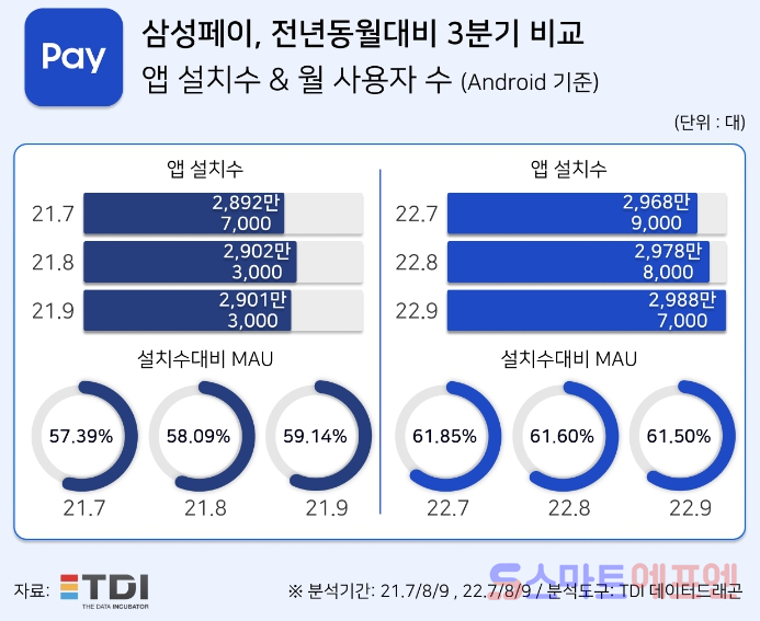 올해 3분기 앱 설치수 대비 MAU는 ▲7월 61.85% ▲8월 61.60% ▲9월 61.50%로 60%대를 넘겼다.