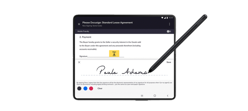 포춘 500대 금융사 25곳 중 24곳이 사용하는 도큐사인(DocuSign)도 지원한다. 사용자는 멀티뷰 모드에서 이메일 첨부파일을 도큐사인의 전자서명으로 드래그 앤 드롭할 수 있으며, S펜과 전용 플렉스 모드를 사용할 수 있다.