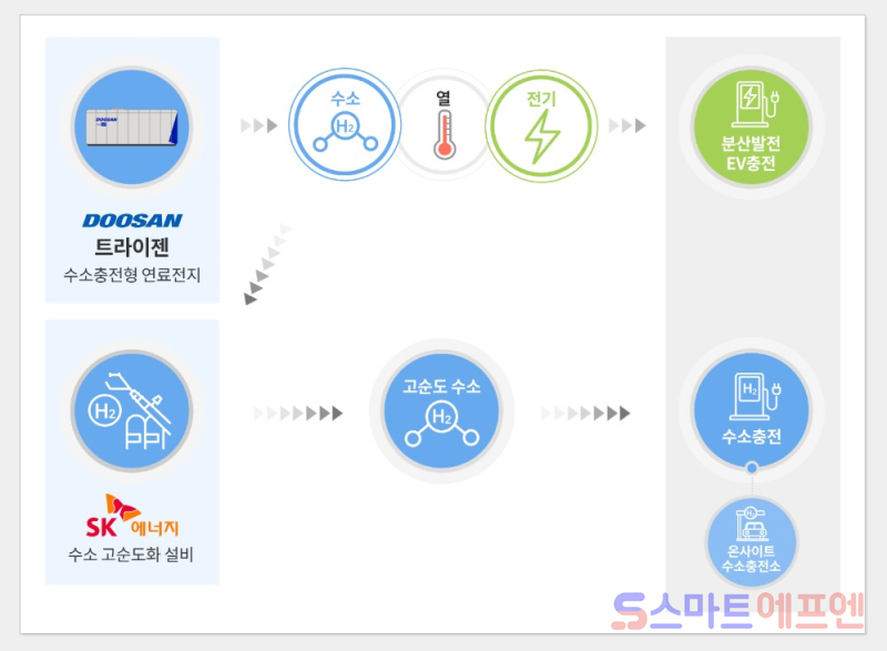 이번 MOU는 SK에너지가 독자 개발한 수소 고순도화 설비를 공급, 운영, 유지보수하고, 두산퓨얼셀은 연료전지를 기반으로 수소, 전기, 열을 동시에 생산할 수 있는 '트라이젠'의 공급과 설치, 유지보수를 맡는 내용으로 구성됐다. SK에너지는 트라이젠과 연계한 수소 고순도화 설비의 실증도 수행한다.