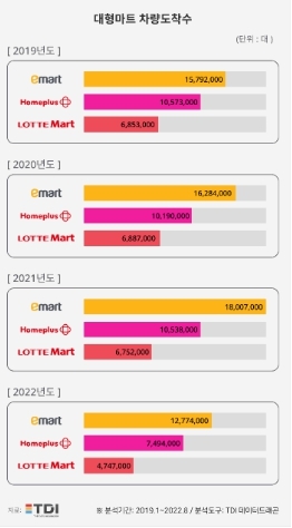 2022년(1~8월) 차량도착수는 ▲이마트 1,277만 4,000대 ▲홈플러스 749만 4,000대 ▲롯데마트 474만 7,000대 등이었다.