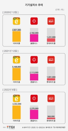 2021년 기기설치수는 ▲이마트몰 316만 8,000대 ▲홈플러스 211만 3,000대 ▲롯데마트몰 100만 1,000대 등이었다. 비대면 소비 트렌드가 지속된 시기였지만 앱별로 희비가 나뉘는 모습이었다.