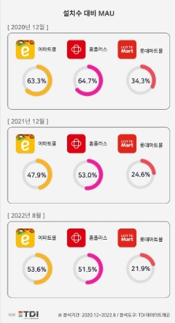 2022년 역시 비슷한 흐름을 보였으며 8월 기준 ▲이마트몰 53.6% ▲홈플러스 51.5% ▲롯데마트몰 21.9% 등이었다.