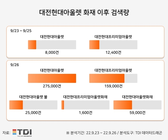 화재 발생 전 9월 23일부터 25일까지 검색량은 대전현대아울렛 8,000건 대전현대프리미엄아울렛 1만 2,400건이다.