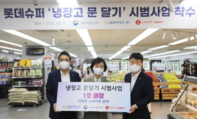 롯데슈퍼는 냉장고 문달기 사업을 시작하며 지난 8월 31일 봉화산역점에서 현장을 견학하고 현장 의견을 청취하는 행사를 진행했다. 이날 행사엔 오유경 식품의약품안전처장, 남창희 롯데슈퍼 대표, 이준호 캡코이에스 대표 등이 참석했다.