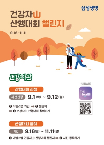 건강자산(山) 산행대회는 삼성생명이 선정한 ‘100대 명산’을 등반하고 삼성생명 ‘더헬스’앱(App)에 인증사진을 등록하면 추첨을 통해 경품을 제공하는 챌린지다.