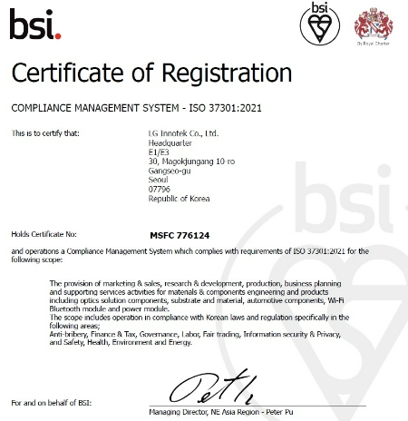LG이노텍이 인증받은 범위는 반부패, 재무, 기업지배구조, 인사노무, 공정거래, 정보보호, 안전환경 등 총 7개 부문이다.