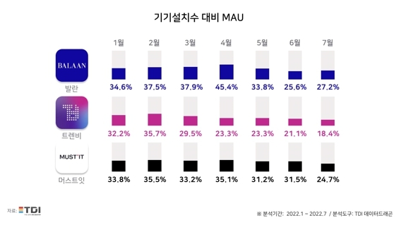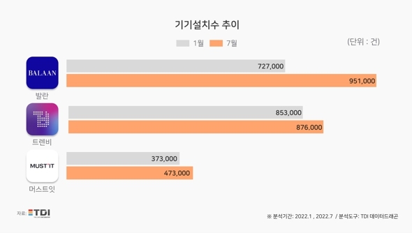 1월 대비 7월 설치수는 발란·머스트잇이 각각 30.8%, 26.8% 성장한 것으로 나타났다. 트렌비는 2.7%를 기록했다.