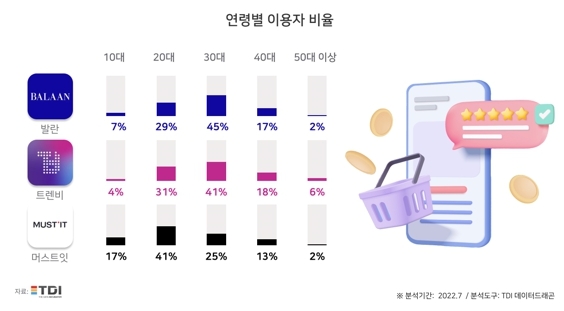 발란·트렌비는 20·30 이용자가 각각 74%, 72%를 차지했다. 두 앱 모두 30대 사용자가 가장 많았다. 특히 트렌비는 50대 이상 이용자가 6%로 다른 앱에 비해 유의미하게 많은 모습을 보였다.