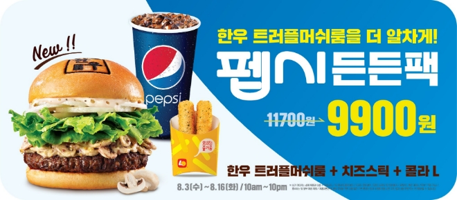 롯데리아는 매장 이용 고객을 위해 구성한 펩시 든든팩은 한우 트러플머쉬룸버거와 디저트 치즈스틱과 콜라 라지 사이즈로 구성했다.