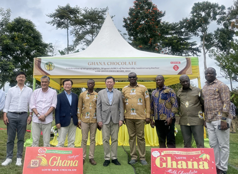 신동빈 롯데그룹 회장을 비롯한 한·일 롯데 식품사 경영진은 지난 8일 가나 수훔(Suhum)지역의 카카오 농장을 점검하고 카카오 묘목을 기증했다. 이번 방문과 묘목 기증은 한·일 롯데가 공동으로 진행하는 ‘지속가능 카카오 원두 프로젝트(Sustainable Cocoa Bean Projects)’의 일환이다. 한국과 일본 롯데 식품사의 대표 상품인 가나 초콜릿은 국내 출시 50주년, 일본에서는 60주년을 맞았다.