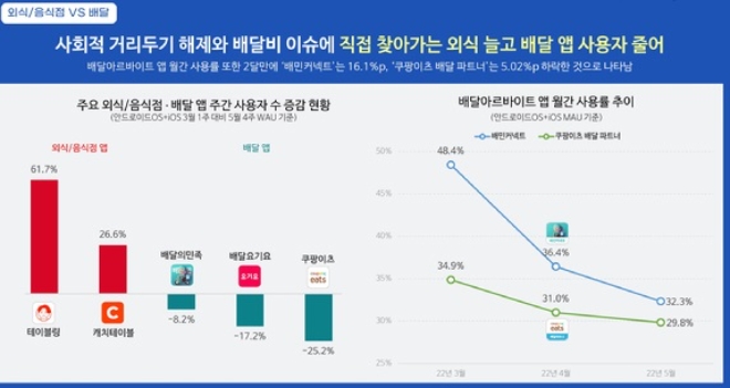앞서, 거리두기가 해제된 지난달 18~24일 배달의민족·쿠팡이츠 등 배달앱 3사의 총 이용자 수는 5047만5131명으로 지난달 동기 대비 11% 감소했다. 같은 기간 배민 하루 평균이용자는 지난달 대비 9%, 요기요는 16%, 쿠팡이츠는 18% 줄었다. 코로나19로 인해 영업이익이 급증하면서 최대 수익을 얻었던 배달앱 시장이 최근 들어 성장세 둔화를 보인 것이다. 이는 엔데믹에 따라 야외활동 증가와 치솟은 배달비에 대한 소비자 반발심이 원인으로 주목됐다. 늘어나는 배달 수요에 따른 라이더 수급 경쟁, 이로 인한 배달료와 수수료 증가가 계속되자 소비자 사이에서 '탈 배달앱' 움직임도 관측된 바 있다.
