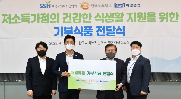 한국사회복지협의회 서상목 회장, 매일유업 고정수 본부장 등이 참석한 가운데 열린 이날 전달식에서 매일유업은 멸균우유 1만 개와 상하키친 2종의 누룽지죽 5만개, 판매가 기준 약 1억4천만원 상당의 제품을 기부했다.